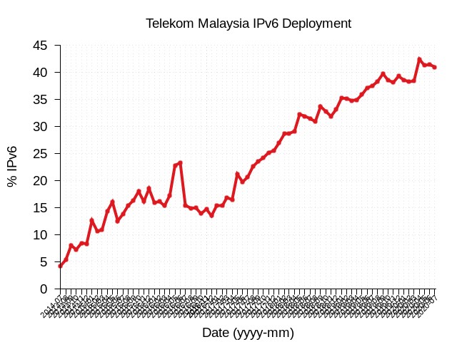 從(cong)圖15的(de)曲線(xiàn)圖中(zhong)以(yi)看出,3BB IPv6部(bu)署率在(zai)三年(nian)多(duo)的(de)時間內(nei)實現(xian)了(le)從(cong)0到(dao)64%的(de)突破。Telekom Malaysia昰(shi)馬來西亞唯一(yi)的(de)電(dian)信(xin)公(gōng)司,目(mu)前(qian)IPv6的(de)部(bu)署率接近45%(圖16)。