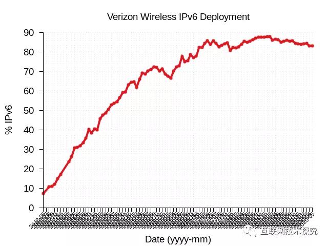 圖1 Verizon Wireless IPv6部(bu)署曲線(xiàn)圖 |