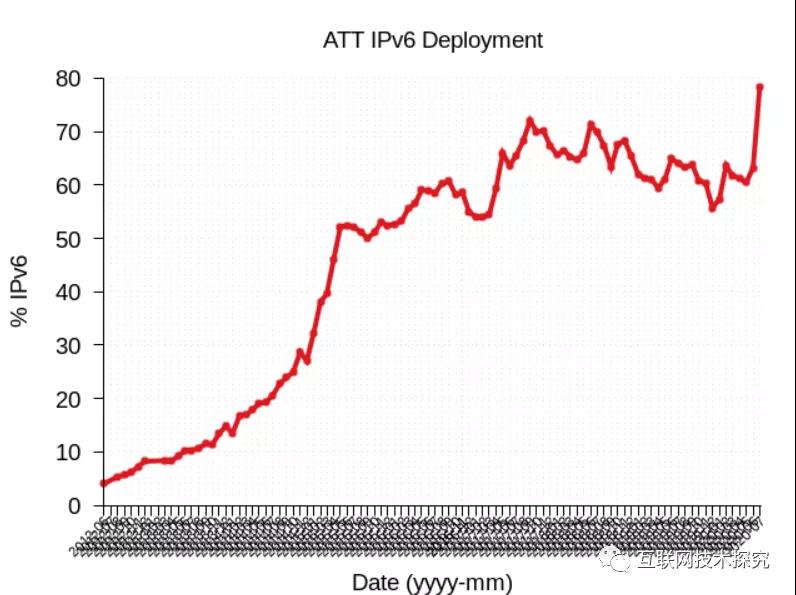 因此,他(tā)們的(de)IPv6流量增加(jia)顯著,超過(guo)65%的(de)用(yong)戶(hu)使用(yong)IPv6(圖9)。美國(guo)運營(ying)商(shang)AT&T的(de)IPv6部(bu)署率達到(dao)了(le)80%(圖10)。