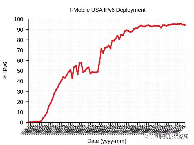 圖2 T-Mobile USA IPv6部(bu)署曲線(xiàn)圖 |