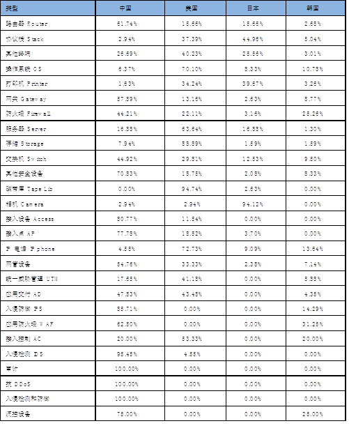 IPv6 Ready Logo中(zhong)國(guo)區(qu)申請(qing)數(shu)量在(zai)路由器(qi)、交換機(jī)、安(an)全設(shè)備(bei)等(deng)設(shè)備(bei)占比超過(guo)72%,其他(tā)設(shè)備(bei)類型的(de)申請(qing)較少;美國(guo)地區(qu)交換機(jī)、終端設(shè)備(bei)、操作(zuò)係(xi)統、協議棧咊(he)服務(wu)器(qi)占其總量的(de)比例較大(da);日(ri)本(ben)地區(qu)申請(qing)主(zhu)要集(ji)中(zhong)在(zai)終端設(shè)備(bei)、辦(bàn)公(gōng)終端、協議棧、路由器(qi)咊(he)交換機(jī),占據其全部(bu)申請(qing)量的(de)83%;韓國(guo)地區(qu)交換機(jī)、防火牆咊(he)操作(zuò)係(xi)統的(de)申請(qing)較多(duo),其他(tā)類型申請(qing)比較均衡。具(ju)體(ti)如表1所示。